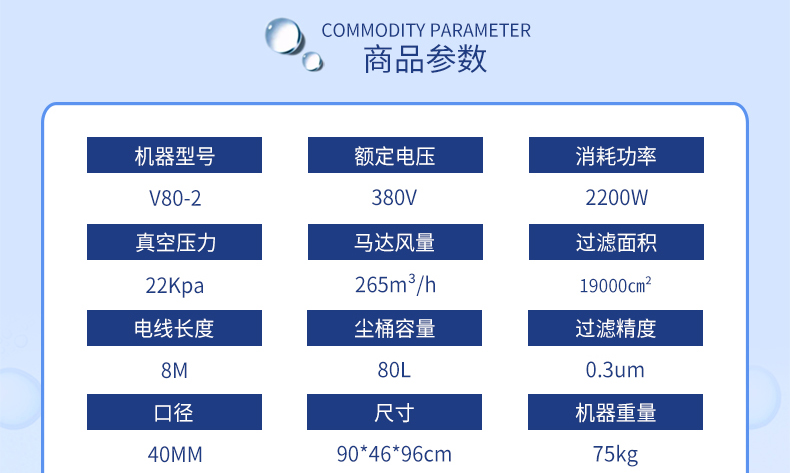 l 耐潔思V80-2是一款工業吸塵器,機器具有漏電,缺相、過熱及過載保護裝置,小型的體積適用于工作區域狹小有不斷有灰塵產生的場所,可固定安裝在大型設備上作為固定吸塵裝置。適用于各類型清理工作非常繁重的工廠。