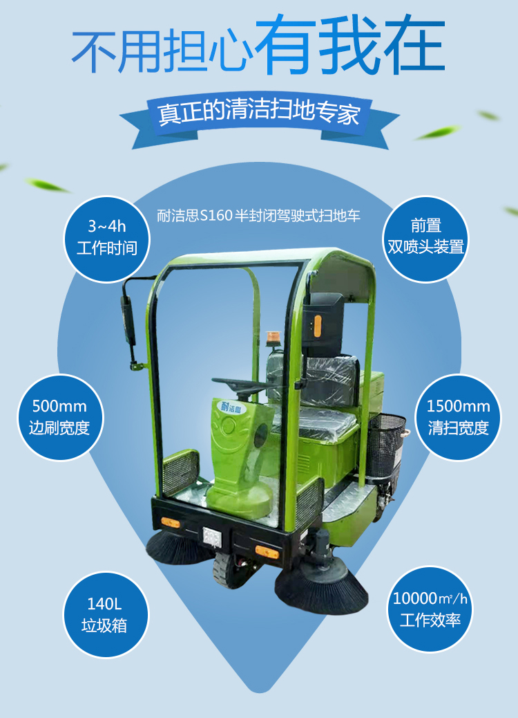 耐潔思S160半封閉駕駛式掃地車主要針對戶外街道、馬路、小區(qū)物業(yè)、工廠室內(nèi)外地面、大型商場外圍、火車站、汽車站、大型物業(yè)廣場、機場外圍等公共場所地面的日常垃圾清掃及保潔工作。